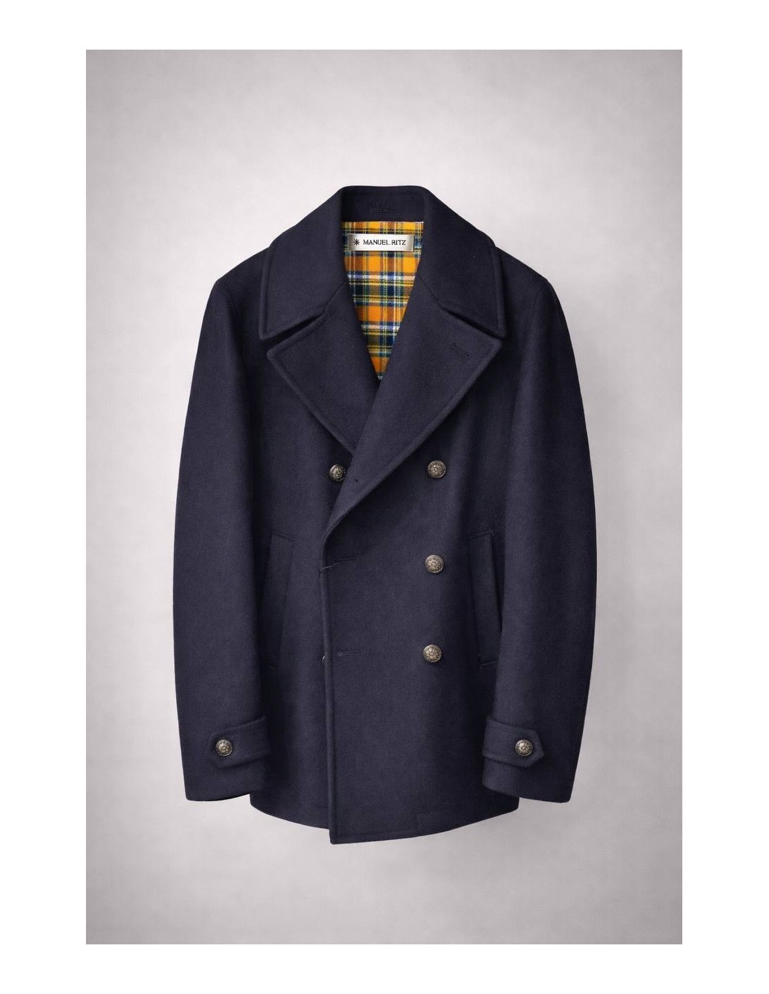 Esterno 80% Lana Vergine 20% Poliammide. Fodera interna scozzese 100% cotone. Chiusura frontale con bottoni metallici doppiopetto. Doppie tasche sui fianchi con chiusura con bottone automatico nascosto. Doppia tasca aperta all'interno. Dettaglio cintura con chiusura a bottone sui polsini. Niente spalline, spacco singolo.