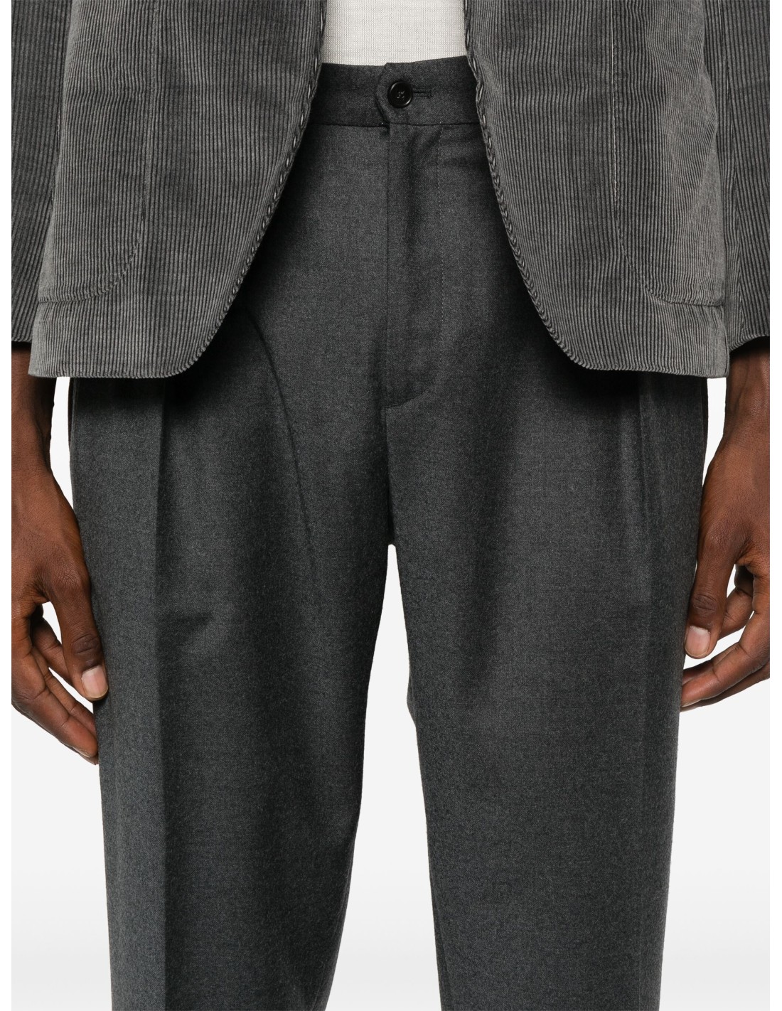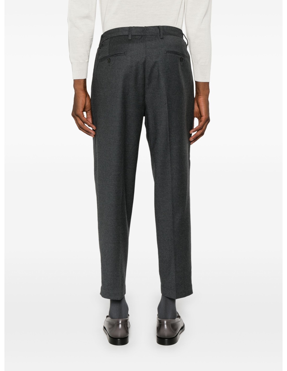 -pantalone in lana -vestibilità comoda -fondo 17 cm -pence girata alla francese -si consiglia una taglia in meno alla propria -elastici laterali in vita -pantalone gia corto alla caviglia-colore grigio antracite